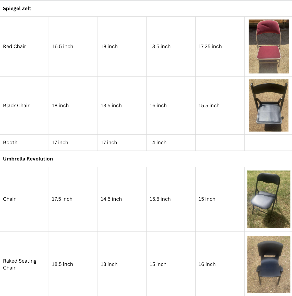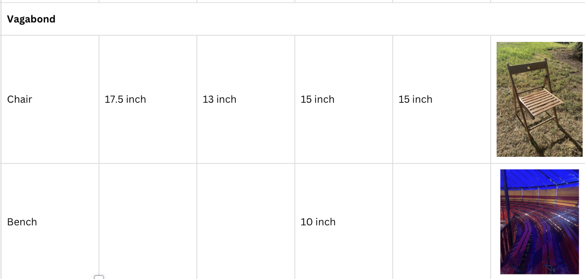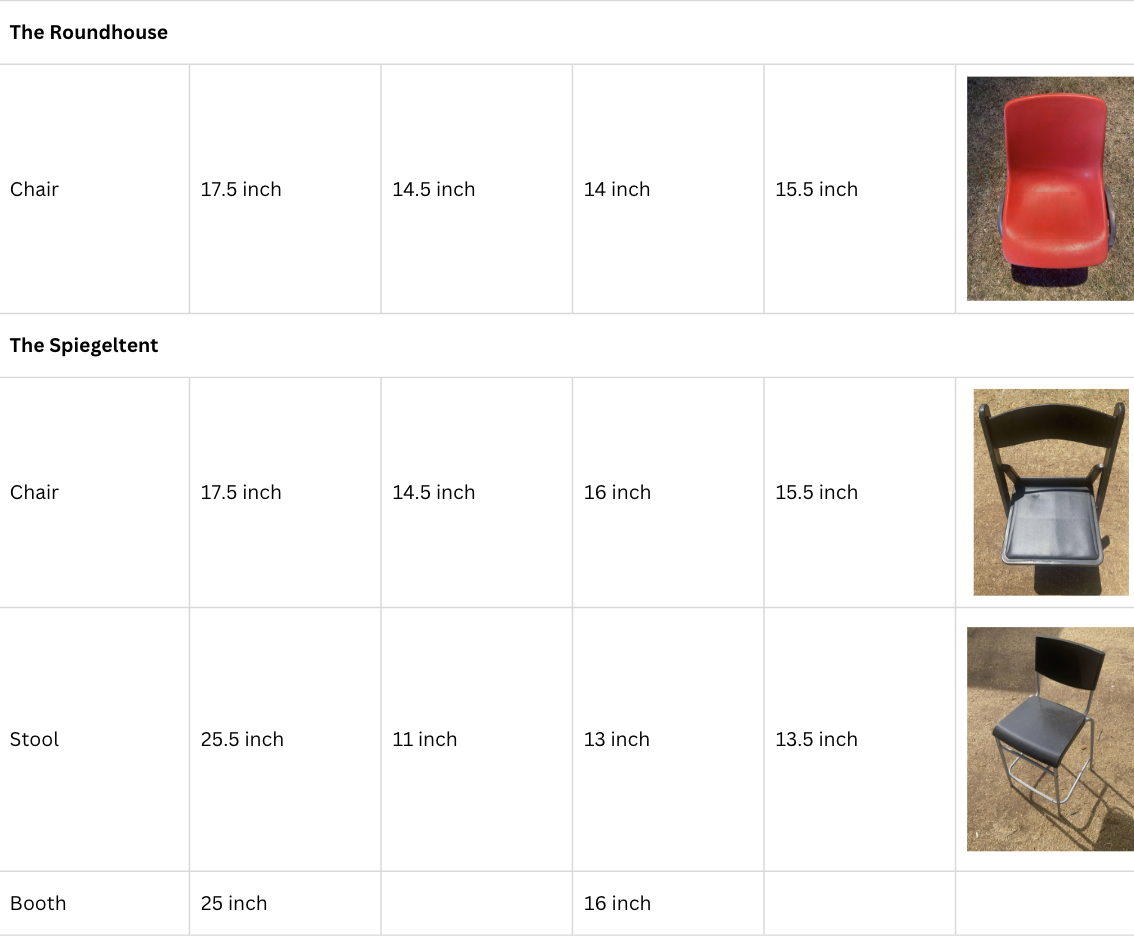 Below is information about the depth, height, and width of some of our seating.