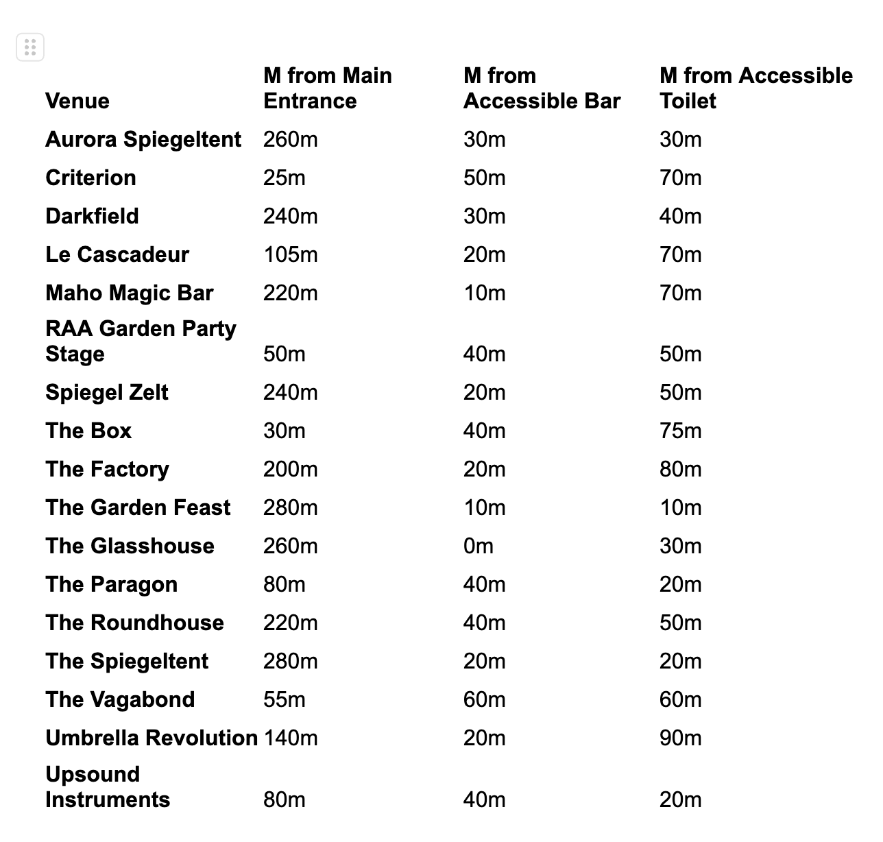 As a guide, here are the distances in metres from the Main Entrance to the Venue, closest Accessible Bar and Closest Accessible Toilet.